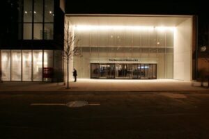 A night view of the museum’s main gallery addition, across from the sculpture garden.