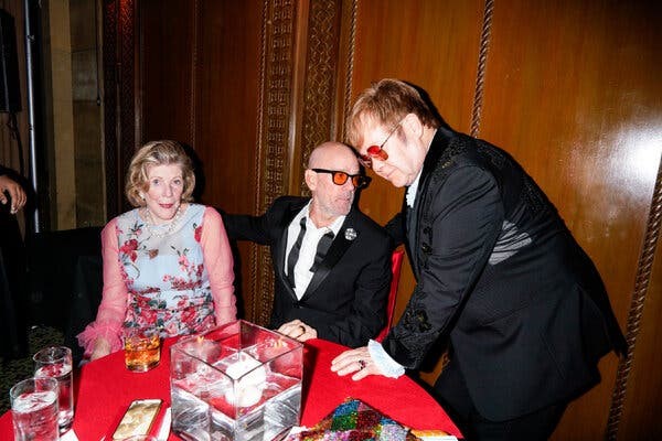 Ms. Gund with Michael Stipe of R.E.M., center, and Elton John at a benefit for the Elton John AIDS Foundation in New York City in 2018. Even into her later years, Ms. Gund was known for always showing up — at museum galas, gallery openings and artists’ often far-flung studios. Credit…Rebecca Smeyne for The New York Times